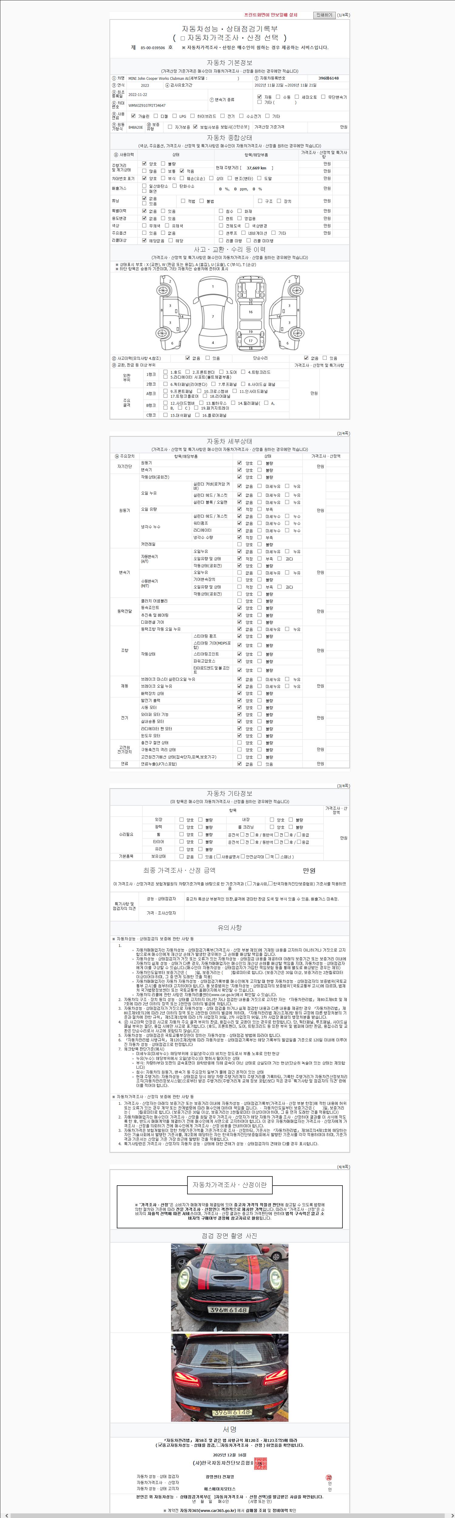 | 주행거리 | 37,669 km | 차량번호 | 396버6148 | 사고유무 | 성능기록부 참조 | 제시번호 | 제 2147483647 호 |