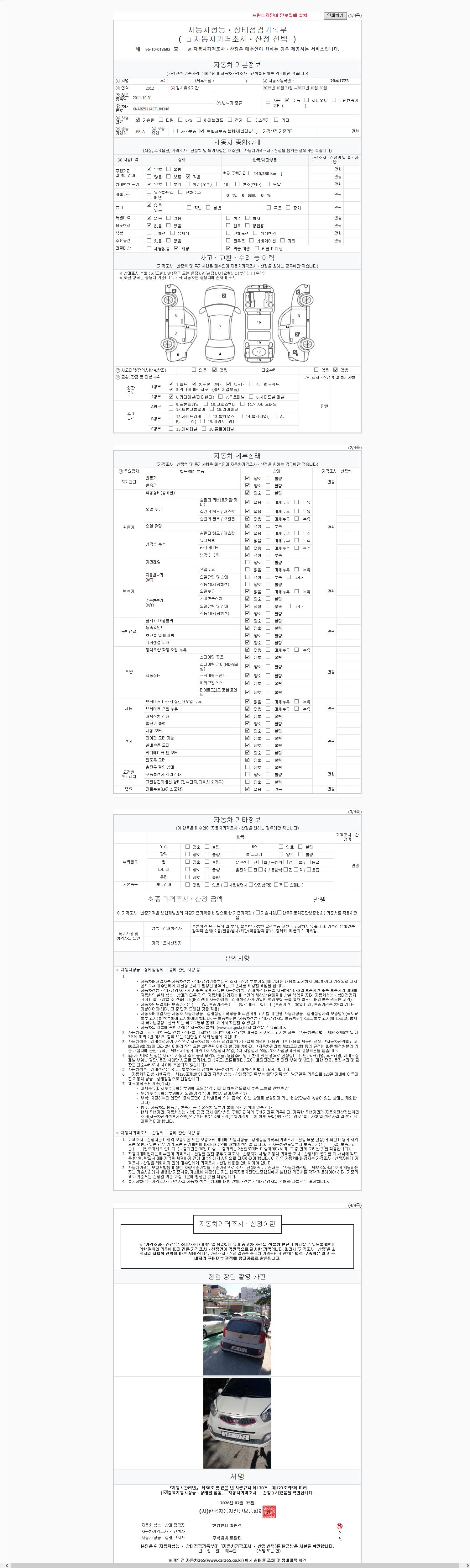 | 주행거리 | 140,280 km | 차량번호 | 20루1773 | 사고유무 | 성능기록부 참조 | 제시번호 | 제 2026024120 호 |