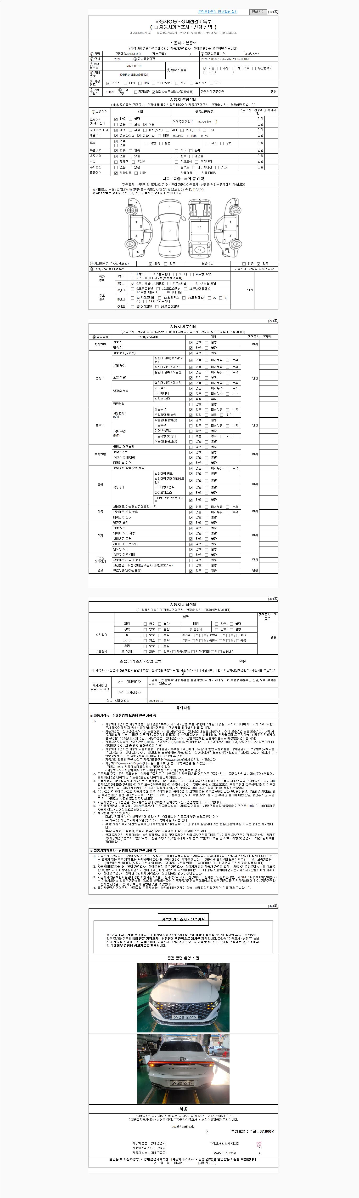 | 주행거리 | 35,221 km | 차량번호 | 393보5247 | 사고유무 | 성능기록부 참조 | 제시번호 | 제 2026012969 호 |