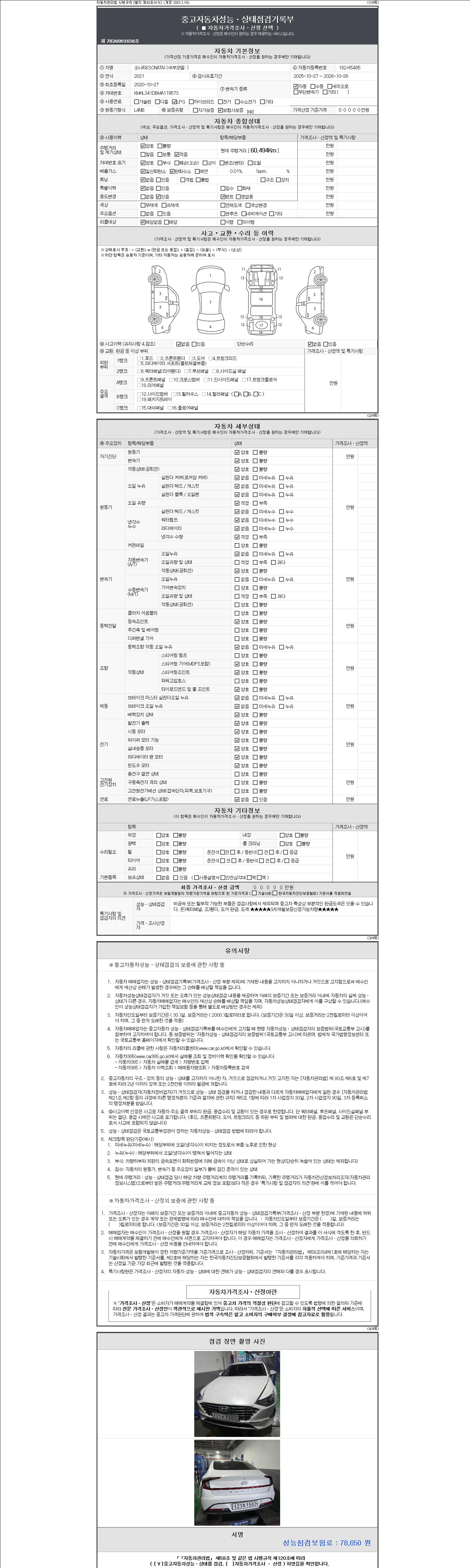 자동차관리법 시행규칙 제120조의 규정에 따라 별지 제 82호서식 《중고자동차 성능, 상태점검 기록부》를 발행한 성능, 상태점검자 및 매매자는 아래의 보증기간 또는 보증거리 이내의 중고자동차, 성능점검 기록부에 기재된 내용과 자동차의 실제 성능, 상태가 다른 경우 계약 또는 관계법령에 따라 매수인에 대하여 책임을 집니다.